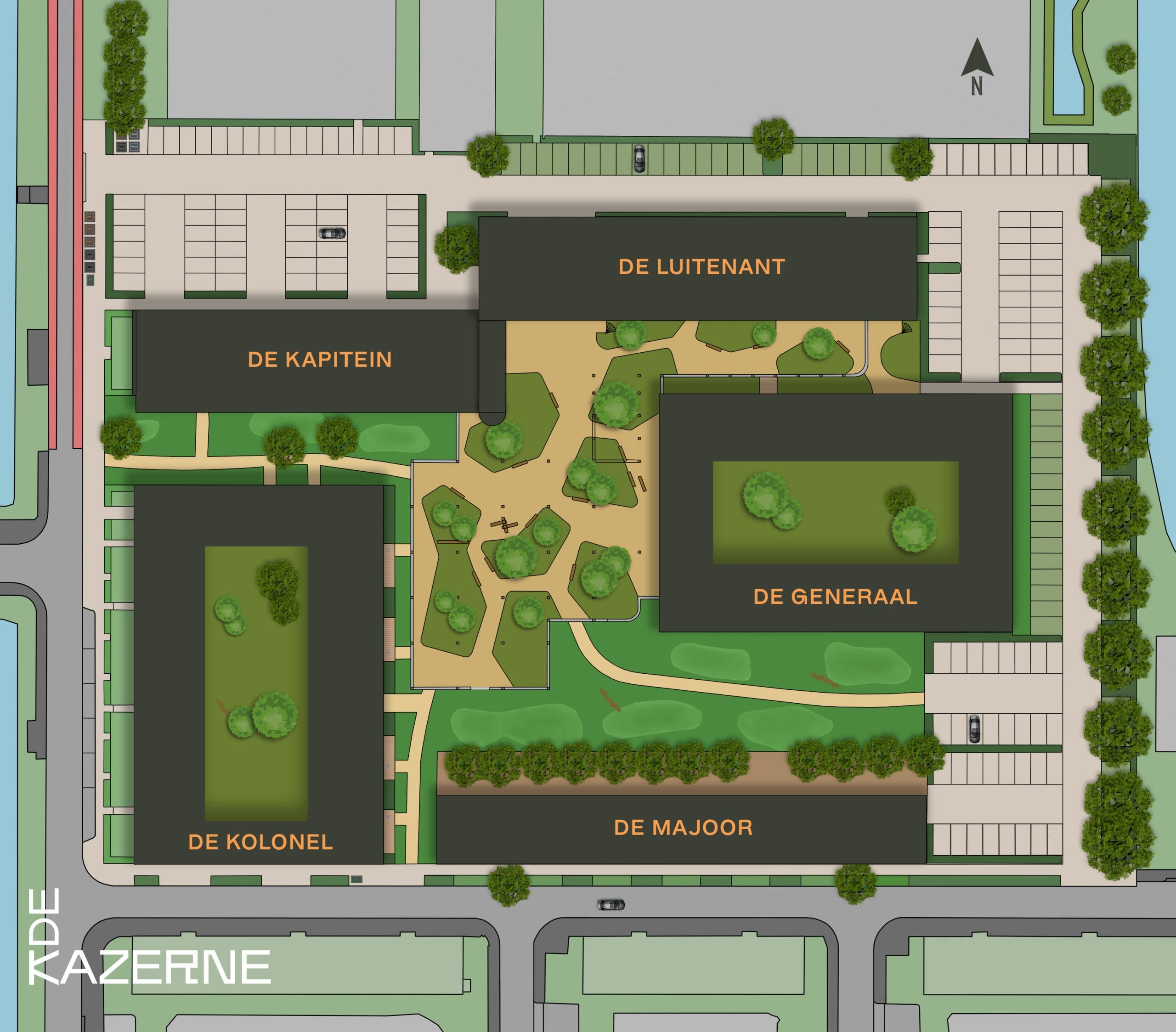 De Kazerne bestaat uit 4 kleinschalige wooncomplexen met ca. 30 tot 68 appartementen.